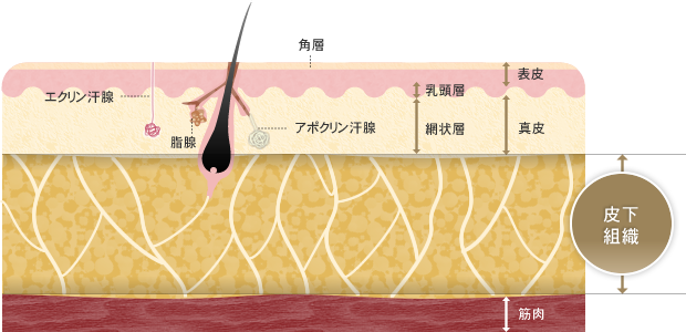 真皮と筋肉の間にある脂肪層は、筋肉や骨などの下部組織から真皮を守るクッションのような働きがあります。また、食物の不足しがちな季節に、動物が冬眠などに向けて脂肪を体内に蓄えようとするのと同様に、人間の身体はエネルギーの備蓄として、また体温を保持する断熱材として脂肪を蓄える仕組みになっています。この脂肪層は、脂肪細胞と呼ばれる、脂質を蓄える細胞から成りたっていて、それら皮下脂肪は、コラーゲン線維により隔てられた脂肪の小片によって構成されています。この小片が大きく膨らみ脂肪に飲み込まれると、セルライトとなって肥満の原因に…。女性は、特に皮膚と下部筋肉が繋がる臀部や太腿に十代後半からセルライトが現われやすい傾向があります。