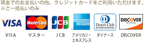 現金でお支払いその他、クレジットカードをご利用いただけます。※ご一括払いのみ