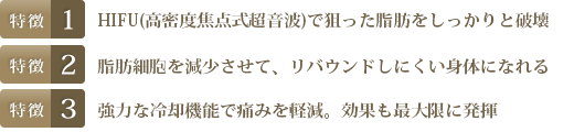 ◎ ライポソニックスよりも高い痩身効果が期待できる。脂肪細胞自体をより強く加熱破壊して体外へ排出、減らすため、リバウンドもしづらい。 |