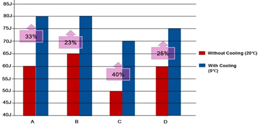 ライポソニックスよりも高度な熱量を安全に生じさせることができるのには高度な冷却機能があるためです。 下のグラフは冷却機能あり、なしで比較した際に使用できた熱量の比較です。しかし当然のことながら冷却ありの方が、高い熱量を安全に与えることができています。
