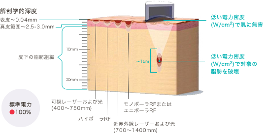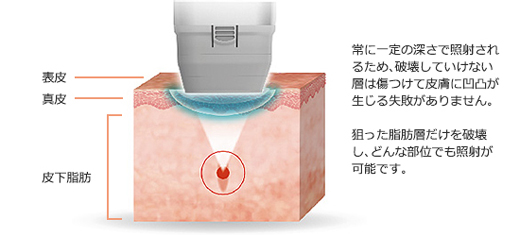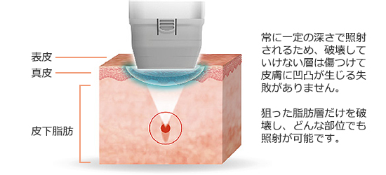 脂肪層の温度が上がるにもかかわらず、皮膚は強力な冷却機能に守られているため火傷の心配はなくまた、痛みも抑えられる治療器です。