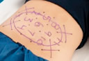 右の写真のように、実際にマス目を照射部分に描いてから正確に照射していきます。1エリアあたり3パスの照射を行い、脂肪層に200J以上の熱量を加えて行きます。