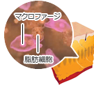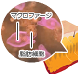 体内で異物を捕える働きがある貪食能をもつ巨大な白血球マクロファージが、破壊された脂肪細胞を食べて消化してしまいます -
