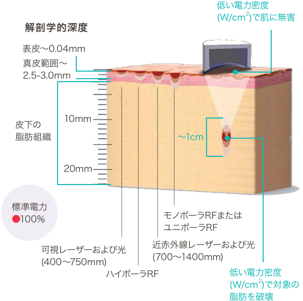 ◎ 体外からHIFUを照射し、狙った脂肪層の脂肪細胞だけに働きかけるので、他の組織に影響はない。 |