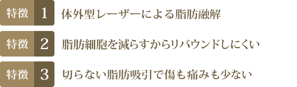レーザーによる痩身というと体内式と呼ばれる、脂肪層に挿入した光ファイバーの先端よりレーザー光を送出し脂肪層を溶かすというのが今までの形でしたが、脂肪吸引同様に、皮膚に穴を開けるため跡が残ってしまうというリスクがあることと、光ファイバーが熱で溶けることで体内に異物が残るリスクがあり日本では敬遠されていました。